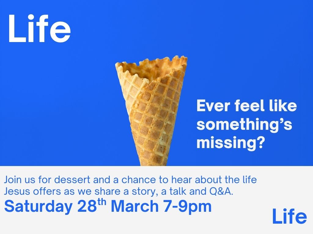 Saturday 28th January, 7pm: we are running a dessert night to consider this feeling we may have and how Jesus can answer it. Come and enjoy some delicious desserts, hear someone’s story about coming to know Jesus and we have an engaging local speaker to give a talk. There will be opportunity for Q&A afterwards.
